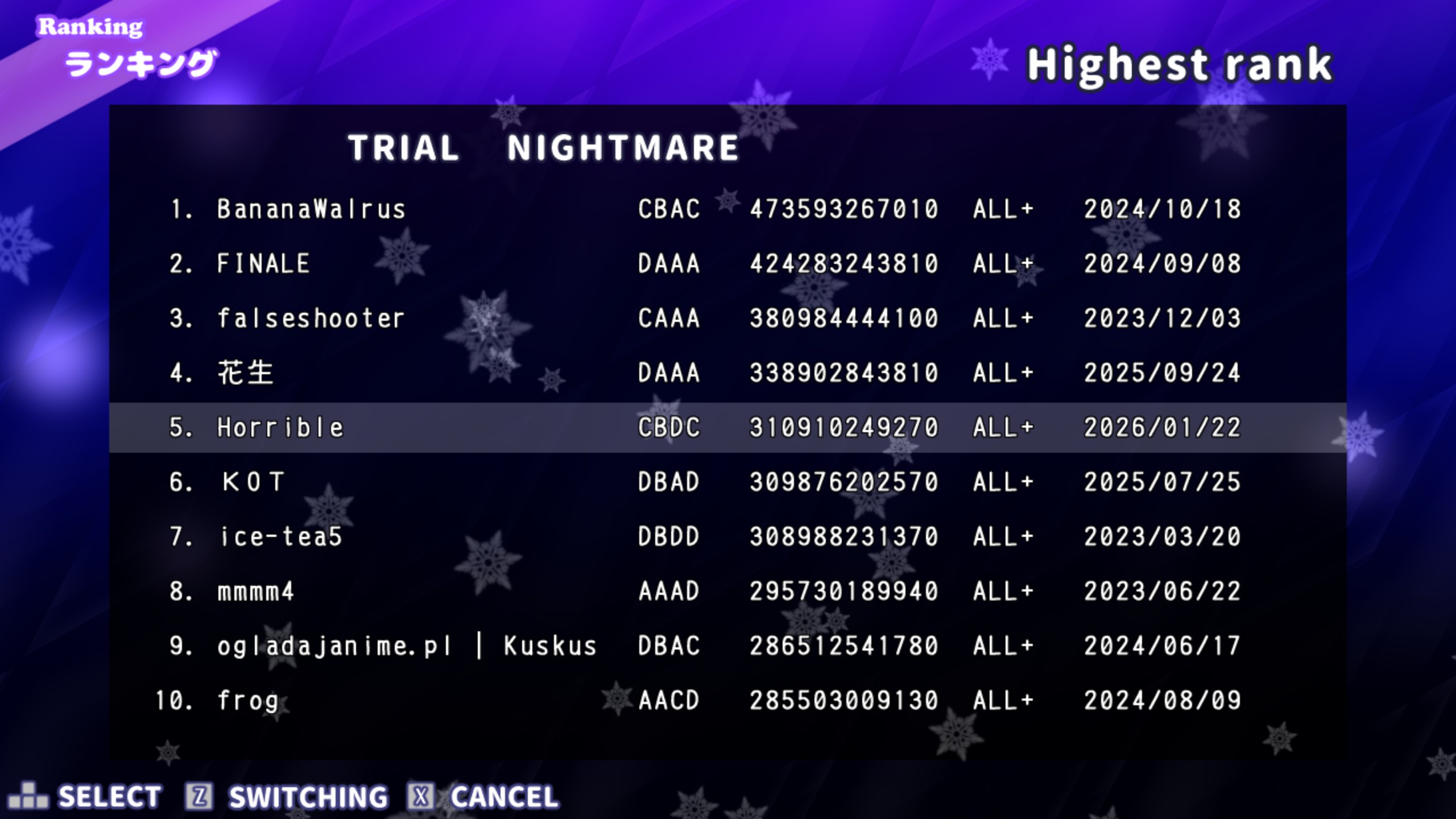 | 1 | Horrible | PC | Homing/Lockon Jewel | Clear+★ | Satellite Guardian | 310,910,249,270 ![]() | 2026-02-01 | ||||||||||