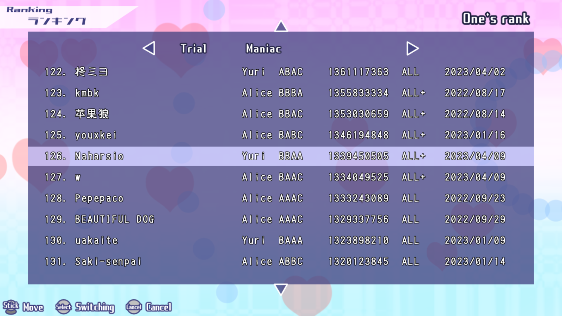 | 2 | Art_Izon | Switch | Yuricocoa | Clear★ | 968,115,560 ![]() | Apparently there's a TLB in this one too - so I guess I have to do another run. | 2023-10-30 | |||||||||