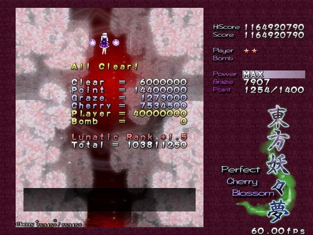 | PC | Sakuya B | Clear★ | 1,323,775,760  | Slowdown 0.25%.