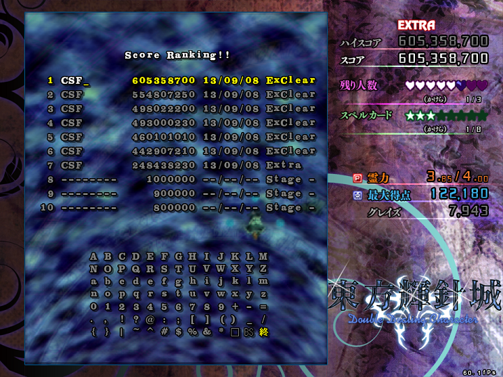 cstarflare's score history for Touhou Kishinjou ~ Double Dealing Character - Extra