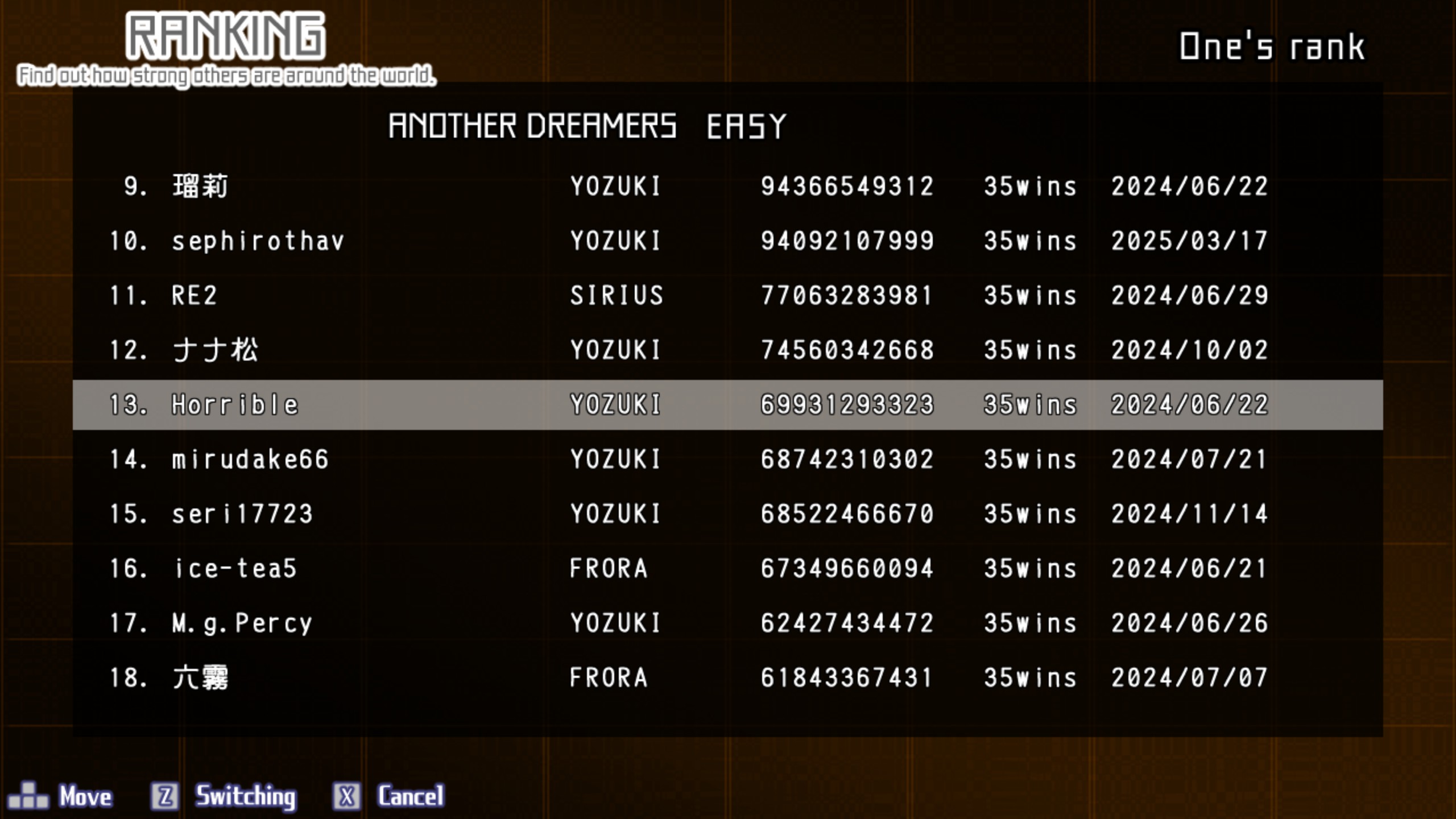 CosmoDreamer Trial - Nightmare - Homing/Lockon Jewel | 310,910,249,270 |  | Redneg Allstars Swing-B... Another - Easy - Yozuki | 69,931,293,323 |  | Redneg Allstars Swing-B... Boss Rush - Very Hard - Yozuki | 55,463,651,787 |  | CosmoDreamer Trial - Nightmare - Homing/Lockon Jewel | 190,991,508,360 |  | CosmoDreamer Trial - Casual Counter - Homing/Lockon Jewel | 226,441,181,460 |  | CosmoDreamer Trial - Expert - Homing/Lockon Jewel | 172,719,395,270 |  | Touhou Youyoumu ~ Perfe... Phantasm - Reimu A | 1,020,525,840 |  | Touhou Youyoumu ~ Perfe... Phantasm - Sakuya A | 950,485,210 |  | Akai Katana Zetsu - Suzuran & Shion | 266,425,706 |  | Touhou Doumeijiu ~ Myst... Ura Normal - Reimu & Utsuho | 30,599,274,003 |  | Eden's Aegis Original - Nanathy | 139,406,870 |  | Randomax Ultra - Dahlia | 8,741,675 |  | Cotton Rock 'n' Roll Extra - Tacoot | 270,609,330 |  | Touhou Doumeijiu ~ Myst... Normal - Sanae & Kanako | 83,556,642,110 |  | Touhou Doumeijiu ~ Myst... Extra - Reimu & Utsuho | 9,046,656,678 |  | Touhou Doumeijiu ~ Myst... Easy - Reimu & Utsuho | 63,032,231,050 |  | Black Bird True - Default | 39,128,224 |  | Alternative Sphere Sequel - Hoshimi Sisters | 2,600,364,232,759,807,790 |  | Alternative Sphere Normal - Hoshimi Sisters | 66,291,436,284,487,762,450 |  | Touhou Makuka Sai ~ Fan... Lunatic - Reimu | 10,855,904,990 |  | Touhou Makuka Sai ~ Fan... Extra - Marisa | 4,999,657,130 |  | Mecha Ritz: Steel Rondo Ver 2.0 - A2 | 16,865,207 |  | Blue Wish Desire Hell - Blue Desire | 68,552,900 |  | Blue Wish Desire Hell - Blue Desire | 72,696,850 |  | Alternative Sphere Sequel - Bluebell Anastasia | 2,234,061,399,009,872,570 |  | Alternative Sphere Normal - Bluebell Anastasia | 57,073,448,098,106,497,410 |  | Alternative Sphere Normal- - Bluebell Anastasia | 50,319,278,781,996,460,060 |  | Super XYX Arcade - Challenging - Cobra | 34,352,580 |  | Touhou Kikeijuu ~ Wily ... Normal - Reimu Otter | 1,120,873,670 |  | Bullet Hell Monday Heaven - Search/Shielding | 158,658,377 |  | Devil Blade Reboot Hard - Default | 13,632,124 |  | Devil Blade Reboot Normal - Default | 17,028,824 |  | Touhou Kikeijuu ~ Wily ... Lunatic - Reimu Otter | 1,332,791,110 |  | Touhou Kinjoukyou ~ Fos... Normal - Reimu Red 1 | 615,288,040 |  | Devil Blade Reboot Easy - Default | 15,994,478 |  | Cotton Rock 'n' Roll Arcade (Home Version) - Tacoot | 277,352,530 |  | Touhou Kaeitzuka ~ Phan... Lunatic - Cirno | 180,894,720 |  | Touhou Kanjuden ~ Legac... Extra - Sanae | 308,472,990 |  | Touhou Kaeitzuka ~ Phan... Lunatic - Reisen | 133,073,790 |  | Cotton X68000 - Cotton | 1,218,780 |  | Crimzon Clover Arcade - Boost - Type Z | 941,393,970 |  | Touhou Koumakyou ~ The ... Extra - Marisa B | 246,533,310 |  | Crimzon Clover Arrange - Boost - Type III | 7,728,552,020 |  | Crimzon Clover Arcade - Novice Boost - Type Z | 2,461,495,930 |  | Touhou Seirensen ~ Unde... Normal - Sanae B | 382,156,650 |  | Touhou Seirensen ~ Unde... Normal - Reimu B | 231,856,930 |  | Crimzon Clover Arcade - Original - Type Z | 603,167,053,630 |  | Patriot Dark Normal - Type-B | 83,517,140 |  | Touhou Youyoumu ~ Perfe... Extra - Reimu A | 829,835,430 |  | TWilight INSanity Sequel - Saijou Twins | 79,856,330 |  | TWilight INSanity Normal - Saijou Twins | 136,853,730 |  | Uwabami Breakers Normal - Isami Asama | 3,263,649 |  | Blue Wish Resurrection Original - Eden's Edge | 27,329,980 |  | Touhou Doumeijiu ~ Myst... Normal - Sanae & Kanako | 41,760,529,029 |  | Touhou Kikeijuu ~ Wily ... Extra - Reimu Wolf | 242,085,950 |  | Touhou Chireiden ~ Subt... Extra - Reimu B | 826,088,470 |  | Touhou Fuumaroku ~ The ... Extra - Reimu A | 17,468,770 |  | Jamestown+ Gauntlet - Legendary - Treason | 6,946,110 |  | Dongfang zizhishu ~ Imm... Lunatic - Clownpiece | 2,309,618,970 |  | Dongfang zizhishu ~ Imm... Lunatic - Marisa | 2,184,125,910 |  | Touhou Chaos of Black L... Lunatic - Yukari & Yuyuko | 2,074,556,010 |  | Dongfang zizhishu ~ Imm... Extra - Marisa | 1,101,857,920 |  | Dongfang zizhishu ~ Imm... Extra - Akira and Rola | 1,254,693,970 |  | Dongfang zizhishu ~ Imm... Hard - Akira and Rola | 2,323,772,840 |  | Dongfang zizhishu ~ Imm... Hard - Reimu | 2,033,481,800 |  | Dongfang zizhishu ~ Imm... Normal - Reimu | 1,628,045,940 |  | Dongfang zizhishu ~ Imm... Normal - Seija | 1,802,684,420 |  | Touhou Tenkuushou ~ Hid... Lunatic - Reimu - Autumn | 330,141,970 |  | Touhou Tenkuushou ~ Hid... Extra - Reimu | 166,521,320 |  | Barrage Fantasia Arcade - Advance - Arm | 1,642,640 |  | The Tawashi Hard - Default | 3,970,484 |  | Touhou Fuujinroku ~ Mou... Extra - Reimu B | 859,077,800 |  | Bullet Hell Monday: Black Accel 1 - Shielding/Lock-On | 1,044,289,201 |  | Bullet Hell Monday: Black Endless 1 - Laser/Lock-On | 462,181,701 |  | Danmaku Unlimited 2 Classic - Hard - Default | 25,277,725,801 |  | Touhou Seirensen ~ Unde... Extra - Sanae B | 293,490,910 |  | Danmaku Unlimited 2 Burst - Normal - Default | 643,755,802,896 |  | eXceed3rd -Jade Penetra... Normal - Rain | 9,978,440 |  | Touhou Koumakyou ~ The ... Lunatic - Reimu B | 129,127,470 |  | Touhou Koumakyou ~ The ... Normal - Marisa A | 127,014,150 |  | Touhou Koumakyou ~ The ... Normal - Marisa A | 122,692,290 |  | Len'en Tasouken ~ Earth... Extra - Kuroji | 60,426,798 |  | Cotton Rock 'n' Roll Hard - Tacoot | 244,045,950 |  | Touhou Suishouguu ~ Cry... Lunatic - Reimu | 455,253,750 |  | Touhou Suishouguu ~ Cry... Extra - Reimu | 501,825,850 |  | RefRain ~prism memori... Re:Normal - Mews | 802,416,560 |  | Touhou Koumakyou ~ The ... Extra - Marisa B | 215,847,580 |  | Hazelnut Hex Moderate - C-Style | 4,006,900 |  | Len'en Tasouken ~ Earth... Normal - Kuroji | 169,513,394 |  | Redneg Allstars Swing-B... Boss Rush - Normal - Nitro Gryce | 112,347,756,269 |  | Redneg Allstars Swing-B... Boss Rush - Normal - Fia Bro | 72,504,772,419 |  | Redneg Allstars Swing-B... Another - Normal - Yozuki | 117,722,217,361 |  | Redneg Allstars Swing-B... Boss Rush - Normal - Sirius Triangle | 105,482,608,146 |  | Blue Wish Re