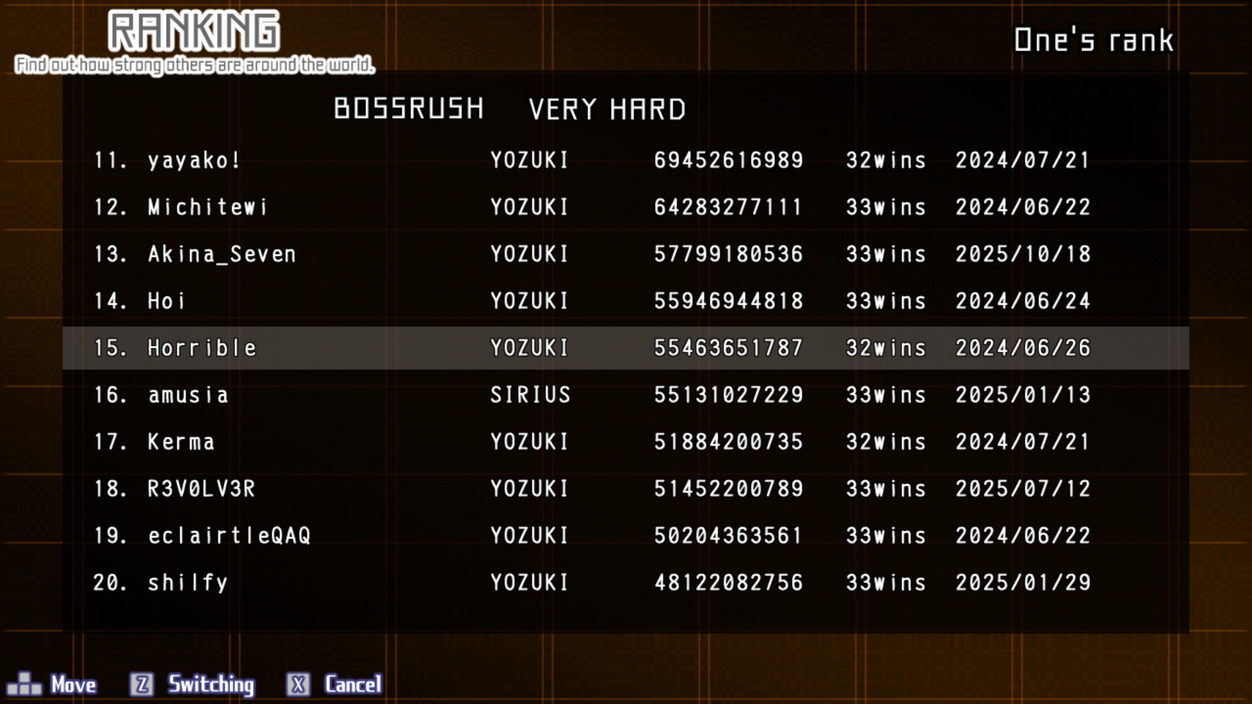 CosmoDreamer Trial - Nightmare - Homing/Lockon Jewel | 310,910,249,270 | 2026-02-01 | Redneg Allstars Swing-B... Another - Easy - Yozuki | 69,931,293,323 | 2026-01-27 | Redneg Allstars Swing-B... Boss Rush - Very Hard - Yozuki | 55,463,651,787 | 2026-01-24 | CosmoDreamer Trial - Nightmare - Homing/Lockon Jewel | 190,991,508,360 | 2026-01-19 | CosmoDreamer Trial - Casual Counter - Homing/Lockon Jewel | 226,441,181,460 | 2026-01-19 | CosmoDreamer Trial - Expert - Homing/Lockon Jewel | 172,719,395,270 | 2026-01-05 | Touhou Youyoumu ~ Perfe... Phantasm - Reimu A | 1,020,525,840 | 2025-12-22 | Touhou Youyoumu ~ Perfe... Phantasm - Sakuya A | 950,485,210 | 2025-12-22 | Akai Katana Zetsu - Suzuran & Shion | 266,425,706 | 2025-12-01 | Touhou Doumeijiu ~ Myst... Ura Normal - Reimu & Utsuho | 30,599,274,003 | 2025-11-28 | Eden's Aegis Original - Nanathy | 139,406,870 | 2025-11-22 | Randomax Ultra - Dahlia | 8,741,675 | 2025-11-21 | Cotton Rock 'n' Roll Extra - Tacoot | 270,609,330 | 2025-11-05 | Touhou Doumeijiu ~ Myst... Normal - Sanae & Kanako | 83,556,642,110 | 2025-11-05 | Touhou Doumeijiu ~ Myst... Extra - Reimu & Utsuho | 9,046,656,678 | 2025-10-20 | Touhou Doumeijiu ~ Myst... Easy - Reimu & Utsuho | 63,032,231,050 | 2025-10-07 | Black Bird True - Default | 39,128,224 | 2025-10-03 | Black Bird True - Default | 46,987,964 | 2025-10-03 | Alternative Sphere Sequel - Hoshimi Sisters | 2,600,364,232,759,807,790 | 2025-09-30 | Alternative Sphere Normal - Hoshimi Sisters | 66,291,436,284,487,762,450 | 2025-09-27 | Touhou Makuka Sai ~ Fan... Lunatic - Reimu | 10,855,904,990 | 2025-09-27 | Touhou Makuka Sai ~ Fan... Extra - Marisa | 4,999,657,130 | 2025-09-27 | Mecha Ritz: Steel Rondo Ver 2.0 - A2 | 16,865,207 | 2025-09-23 | Blue Wish Desire Hell - Blue Desire | 68,552,900 | 2025-09-23 | Blue Wish Desire Hell - Blue Desire | 72,696,850 | 2025-09-23 | Alternative Sphere Sequel - Bluebell Anastasia | 2,234,061,399,009,872,570 | 2025-09-22 | Mecha Ritz: Steel Rondo Ver 2.0 - E1 | 12,101,615 | 2025-09-22 | Alternative Sphere Normal - Bluebell Anastasia | 57,073,448,098,106,497,410 | 2025-09-20 | Alternative Sphere Normal- - Bluebell Anastasia | 50,319,278,781,996,460,060 | 2025-09-20 | Super XYX Arcade - Challenging - Cobra | 34,352,580 | 2025-09-18 | Bullet Hell Monday Normal - Phantom | 140,415,691 | 2025-09-06 | Bullet Hell Monday Normal - Wide | 121,658,945 | 2025-09-05 | Bullet Hell Monday Normal - Search | 110,454,990 | 2025-09-05 | Bullet Hell Monday Accel 2 - Search/Shielding | 160,546,563 | 2025-09-05 | Bullet Hell Monday Endless 2 - Search/Shielding | 206,012,592 | 2025-09-04 | Bullet Hell Monday Accel 1 - Search/Shielding | 918,846,147 | 2025-09-03 | Touhou Kikeijuu ~ Wily ... Normal - Reimu Otter | 1,120,873,670 | 2025-09-03 | Bullet Hell Monday Heaven - Search/Shielding | 158,658,377 | 2025-08-31 | Bullet Hell Monday Hard - Shielding | 133,446,293 | 2025-08-28 | Bullet Hell Monday Endless 1 No-Shielding - Search/Wide | 341,919,157 | 2025-08-28 | Devil Blade Reboot Hard - Default | 13,632,124 | 2025-08-26 | Devil Blade Reboot Normal - Default | 17,028,824 | 2025-08-25 | Touhou Kikeijuu ~ Wily ... Lunatic - Reimu Otter | 1,332,791,110 | 2025-08-23 | Touhou Kinjoukyou ~ Fos... Normal - Reimu Red 1 | 615,288,040 | 2025-08-23 | Devil Blade Reboot Easy - Default | 15,994,478 | 2025-08-23 | Cotton Rock 'n' Roll Hard - Tacoot | 254,641,230 | 2025-08-05 | Cotton Rock 'n' Roll Arcade (Home Version) - Tacoot | 277,352,530 | 2025-08-05 | Touhou Kaeitzuka ~ Phan... Lunatic - Cirno | 180,894,720 | 2025-07-27 | Touhou Kanjuden ~ Legac... Extra - Sanae | 308,472,990 | 2025-07-20 | Touhou Kaeitzuka ~ Phan... Lunatic - Reisen | 133,073,790 | 2025-07-15 | Cotton X68000 - Cotton | 1,218,780 | 2025-07-13 | Crimzon Clover Arcade - Boost - Type Z | 941,393,970 | 2025-07-08 | Touhou Koumakyou ~ The ... Extra - Marisa B | 246,533,310 | 2025-07-08 | Crimzon Clover Arrange - Boost - Type III | 7,728,552,020 | 2025-06-23 | Crimzon Clover Arcade - Novice Boost - Type Z | 2,461,495,930 | 2025-06-21 | Touhou Seirensen ~ Unde... Normal - Sanae B | 382,156,650 | 2025-06-20 | Touhou Seirensen ~ Unde... Normal - Reimu B | 231,856,930 | 2025-06-10 | Crimzon Clover Arcade - Original - Type Z | 603,167,053,630 | 2025-05-30 | Patriot Dark Normal - Type-B | 83,517,140 | 2025-05-11 | Touhou Youyoumu ~ Perfe... Extra - Reimu A | 829,835,430 | 2025-05-09 | TWilight INSanity Sequel - Saijou Twins | 79,856,330 | 2025-03-27 | TWilight INSanity Normal - Saijou Twins | 136,853,730 | 2025-03-26 | Uwabami Breakers Normal - Isami Asama | 3,263,649 | 2025-03-24 | Blue Wish Resurrection Original - Eden's Edge | 27,329,980 | 2025-03-22 | Touhou Doumeijiu ~ Myst... Normal - Sanae & Kanako | 41,760,529,029 | 2025-03-16 | Touhou Kikeijuu ~ Wily ... Extra - Reimu Wolf | 242,085,950 | 2025-03-12 | Touhou Chireiden ~ Subt... Extra - Reimu B | 826,088,470 | 2025-02-22 | Touhou Fuumaroku ~ The ... Extra - Reimu A | 17,468,770 | 2025-02-08 | Jamestown+ Gauntlet - Legendary - Treason | 6,946,110 | 2025-02-06 | Bullet Hell Monday: Black Black - Normal - Lock-On/Shielding | 122,940,484 | 2025-02-04 | Dongfang zizhishu ~ Imm... Lunatic - Clownpiece | 2,309,618,970 | 2025-02-04 | Dongfang zizhishu ~ Imm... Lunatic - Marisa | 2,184,125,910 | 2025-02-04 | Touhou Chaos of Black L... Lunatic - Yukari & Yuyuko | 2,074,556,010 | 2025-02-02 | Dongfang zizhishu ~ Imm... Extra - Marisa | 1,101,857,920 | 2025-01-30 | Dongfang zizhishu ~ Imm... Extra - Akira and Rola | 1,254,693,970 | 2025-01-30 | Dongfang zizhishu ~ Imm... Hard - Akira and Rola | 2,323,772,840 | 2025-01-30 | Dongfang zizhishu ~ Imm... Hard - Reimu | 2,033,481,800 | 2025-01-28 | Dongfang zizhishu ~ Imm... Normal - Reimu | 1,628,045,940 | 2025-01-28 | Dongfang zizhishu ~ Imm... Normal - Seija | 1,802,684,420 | 2025-01-28 | Touhou Tenkuushou ~ Hid... Lunatic - Reimu - Autumn | 330,141,970 | 2025-01-20 | Touhou Tenkuushou ~ Hid... Extra - Reimu | 166,521,320 | 2025-01-15 | Barrage Fantasia Arcade - Advanc