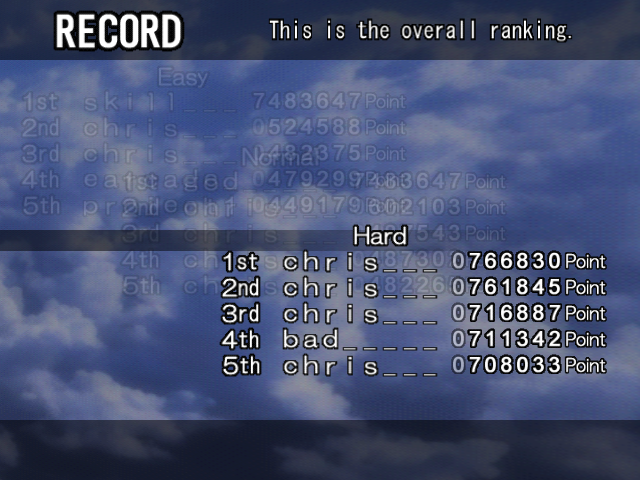 QP Shooting - Dangerous!! Super - QP | 61,140,743 |  | Touhou Houtenkyou ~ T... Lunatic Route A - Marisa & Byakuren Green | 3,570,537,030 |  | Touhou Youyoumu ~ Perfe... Lunatic - Sakuya A | 465,295,820 |  | Touhou Youyoumu ~ Perfe... Lunatic - Reimu B | 560,377,040 |  | Soreyuke Burunyanman Po... Hard - Sukun | 12,427,658 |  | Danmakai: Red Forbidden... Lunatic - Diana Muster Cruel | 3,379,682,270 |  | Touhou Koumakyou ~ The ... Lunatic - Reimu B | 165,238,560 |  | Touhou Koumakyou ~ The ... Lunatic - Reimu A | 131,365,940 |  | Touhou Kaeitzuka ~ Phan... Lunatic - Cirno | 140,694,700 |  | Touhou Koumakyou ~ The ... Lunatic - Marisa A | 126,455,730 |  | Touhou Koumakyou ~ The ... Lunatic - Marisa B | 116,587,760 |  | Touhou Kaeitzuka ~ Phan... Lunatic - Reisen | 119,660,590 |  | Xmas Shooting Scramble Miracle Night - QP | 32,601,026 |  | Xmas Shooting Scramble Miracle Night - QP | 28,418,506 |  | Sora Arcade - Hard - Sora | 1,348,330 |  | Touhou Chireiden ~ Subt... Lunatic - Reimu C | 622,948,310 |  | Touhou Tenkuushou ~ Hid... Lunatic - Reimu - Autumn | 462,797,570 |  | eXceed3rd -Jade Penetra... Exceed - Rain | 11,135,390 |  | Gundemonium Recollection Demonic - Eryth | 100,225,930 |  | Gundemonium Recollection Demonic - Eryth | 74,007,210 |  | Espgaluda Arcade - Ageha | 23,274,940 |  | QP Shooting - Dangerous!! Super - QP | 37,273,301 |  | Suguri Arcade - Hard - Suguri | 807,361 |  | Suguri Arcade - Hard - Suguri | 791,885 |  | Danmakai: Red Forbidden... Lunatic - Diana Muster Cruel | 2,510,527,060 |  | Danmakai: Red Forbidden... Extra - Diana Muster Cruel | 135,770,050 |  | Danmakai: Red Forbidden... Lunatic - Diana Muster Cruel | 1,764,254,410 |  | Danmakai: Red Forbidden... Lunatic - Diana Muster Cruel | 777,419,290 |  | Hishou Ayu Normal - Default | 11,592,320 |  | Hishou Ayu Normal - Default | 11,071,700 |  | Touhou Koumakyou ~ The ... Lunatic - Reimu B | 151,111,870 |  | Touhou Koumakyou ~ The ... Extra - Reimu B | 111,528,030 |  | Touhou Koumakyou ~ The ... Lunatic - Reimu B | 141,278,860 |  | Touhou Koumakyou ~ The ... Lunatic - Reimu B | 139,813,070 |  | Touhou Fuujinroku ~ Mou... Extra - Reimu B | 335,492,250 |  | Touhou Fuujinroku ~ Mou... Lunatic - Reimu A | 566,288,810 |  | Touhou Kaeitzuka ~ Phan... Lunatic - Eiki | 75,683,040 |  | Touhou Eiyashou ~ Imper... Lunatic - Reimu & Yukari | 1,747,111,660 |  | Touhou Eiyashou ~ Imper... Lunatic - Reimu & Yukari | 1,440,422,800 |  | Mushihimesama Maniac - Default | 94,906,854 |  | QP Shooting - Dangerous!! Easy - QP | 11,956,291 |  | QP Shooting - Dangerous!! Hard - QP | 32,147,300 |  | QP Shooting - Dangerous!! Hard - QP | 30,392,943 |  | QP Shooting - Dangerous!! Hard - QP | 25,861,655 |  | Donpachi Arcade - C Type | 10,003,200 |  | Dodonpachi Arcade Mode - C Laser | 28,342,310 |  | Mushihimesama Futari Ve... Original - Abnormal Palm | 181,628,003 |  | Touhou Kishinjou ~ Doub... Hard - Sakuya A | 364,063,010 |  | Touhou Shinreibyou ~ Te... Hard - Reimu | 268,517,380 |  | Touhou Chireiden ~ Subt... Normal - Reimu A | 284,730,160 |  | Touhou Chireiden ~ Subt... Normal - Reimu A | 212,576,820 |  | Touhou Seirensen ~ Unde... Normal - Sanae B | 135,109,110 |  | eXceed3rd -Jade Penetra... Normal - Rain | 11,779,730 |  | eXceed3rd -Jade Penetra... Hard - Rain | 10,957,210 |  | Hishou Ayu Normal - Default | 9,455,840 |  | eXceed3rd -Jade Penetra... Normal - Rain | 7,577,410 |  | eXceed3rd -Jade Penetra... Hard - Rain *Obsoleted run | 5,687,160 |  | Deathsmiles II X Mode - Follett | 3,336,605,126 |  | Royal Edoma Engine Novice - Platina | 4,350,460 |  | Royal Edoma Engine Novice - Platina | 4,068,260 |  | Gundemonium Recollection Ain Soph Aur - Eryth | 18,428,300 |  | Touhou Eiyashou ~ Imper... Hard - Reimu & Yukari | 1,343,366,660 |  | Len'en Reiretsuden ~ Re... Normal - Yabusame & Tsubakura | 140,550,865 |  | Gundemonium Recollection Unlimited - Eryth | 66,802,610 |  *Dead link | Gundemonium Recollection Unlimited - Eryth | 66,641,450 |  | Deathsmiles Arcade - Souffle | 110,339,182 |  | Deathsmiles Mega Black ... Arcade - Windia | 394,079,811 |  | Deathsmiles Arcade - Rosa | 71,536,211 |  *Dead link | Hishou Ayu Normal - Default | 6,385,410 |  | Mushihimesama Cave Mats... Original - M-Shot | 61,167,808 |  | Twinkle Star Sprites Character - Sprites | 1,271,780 |  | Touhou Fuujinroku ~ Mou... Hard - Reimu A | 548,072,910 |  | Stella Vanity -Prelude ... Rule(Strict) - Type-S - Arcade - Azerlete | 673,316,040 |  | Touhou Youyoumu ~ Perfe... Hard - Sakuya B | 342,693,370 |  | Gundemonium Recollection Unlimited - Eryth | 53,338,740 |  | Graze Counter Arcade - Type-4 | 695,368,190 |  | eXceed3rd -Jade Penetra... Normal - Rain | 5,429,980 |  | Barrage Musical ~A Fant... Hard - Type A | 21,504,562,780 |  | Like Dreamer All Stage Tour - Expert - Yuricocoa | 2,947,420,828 |  | Barrage Musical ~A Fant... Hard - Type A | 18,980,396,530 |  | Barrage Musical ~A Fant... Hard - Type A | 12,611,074,280 |  | Touhou Youyoumu ~ Perfe... Normal - Sakuya A | 422,233,710 |  | eXceed: Gun Bullet Chil... Hard - Miyabi | 496,362 |  | Eden's Aegis Original - Ridmie | 52,874,620 |  | Eden's Aegis Heaven - Nanathy | 69,868,060 |  | Eden's Aegis Original - Eve | 63,370,180 |  | Eden's Aegis Original - Eve | 58,808,730 |  | Eden's Aegis Original - Maple | 41,665,490 |  | Danmakai: Red Forbidden... Hard - Angelica Pristage | 252,684,270 |  | Parity Shot Integral Hard - Parity | 23,359,800 |  | Parity Shot Integral Hard - Parity | 20,967,100 |  | eXceed3rd -Jade Penetra... Original - Rain | 266,629 |  | Twinkle Star Sprites Character - Tinker and Linker | 1,250,240 |  | Touhou Kaeitzuka ~ Phan... Lunatic - Aya | 46,180,640 |  | Touhou Kaeitzuka ~ Phan... Lunatic - Aya | 13,137,830 |  | Touhou Kaeitzuka ~ Phan... Lunatic - Medicine | 59,129,900 |  | Gundemonium Recollection Unlimited - Eryth | 18,761,480 |  | Touhou Kaeitzuka ~ Phan... Hard - Aya | 7,285,350 |  | Twinkle Star Sprites Character - Macky and Pentell | 1,527,160 |  | Sora Arcade - Hard - Sora | 1,225,946 |