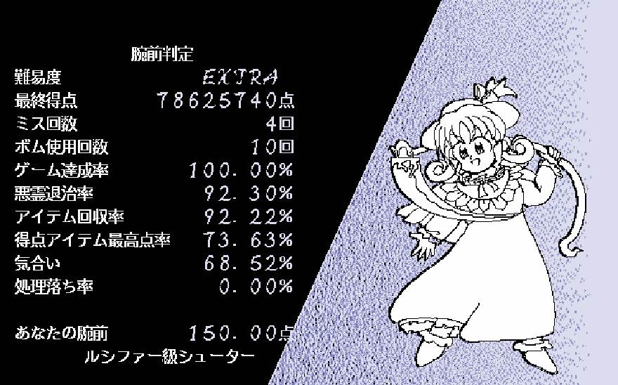 | ★ | Reimu | 102,765,870 | | | | ★ | Mima | 129,379,490 | | | | ★ | Marisa | 109,691,220 | | | | ★ | Ellen | 112,796,380 | | | | ★ | Kotohime | 126,239,720 | | | | ★ | Kana | 109,828,660 | | | | ★ | Rikako | 95,298,150 | | | | ★ | Chiyuri | 132,887,850 | 2/9 | | | ★ | Yumemi | 107,138,760 | | | |