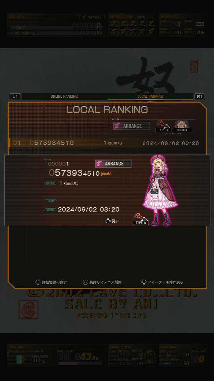 Crimzon Clover Arrange - Original - Type I | 20,746,243,314,600 | 2025-12-09 | Crimzon Clover Arrange - Original - Type I | 19,561,064,525,680 | 2025-12-09 | Crimzon Clover Arrange - Original - Type I | 14,822,400,449,700 | 2025-12-04 | Blade Buster 5 Minute - Default | 1,397,300 | 2025-12-02 | Mushihimesama Futari Bl... Another Ver. - Original - Reco | 643,913,368 | 2025-11-25 | Triggerheart Exelica X360 - Normal - Exelica | 113,957,246 | 2025-11-25 | Twin Tiger Shark Easy - Default | 12,896,450 | 2025-11-24 | Blue Revolver Double Ac... Hyper - Val/Hyper Laser | 219,063,700 | 2025-11-01 | Rapid Hero Arcade - Default | 2,048,640 | 2025-10-12 | Stagger 1 Arcade - Red Hawk | 1,890,300 | 2025-10-12 | Radirgy Arcade Mode - 123 Laser | 42,842,330 | 2025-10-12 | Mushihimesama Original - Default | 52,119,026 | 2025-09-21 | Mushihimesama Original - Default | 11,395,115 | 2025-09-20 | Deathsmiles Mega Black ... Ver 1.1 - Souffle | 260,938,724,009 | 2025-02-11 | Blue Revolver Hyper - Val/Hyper Laser | 104,487,090 | 2025-01-08 | Blue Revolver Normal - Val/Hyper Laser | 109,667,970 | 2025-01-08 | Blue Revolver Double Ac... Normal - Val/Hyper Laser | 226,558,500 | 2025-01-08 | Blue Revolver Double Ac... Normal - Val/Hyper Laser | 218,613,200 | 2025-01-08 | Blue Revolver Double Ac... Hyper - Val/Hyper Laser | 209,964,800 | 2025-01-04 | Jikkyou Oshaberi Parodi... Omake 1 - Soitsu | 6,115,200 | 2024-12-23 | Blue Revolver Double Ac... Hyper - Val/Hyper Laser | 205,408,200 | 2024-12-13 | Blue Revolver Double Ac... Normal - Val/Hyper Laser | 215,836,500 | 2024-12-13 | Blue Revolver Double Ac... Hyper - Val/Hyper Laser | 190,977,300 | 2024-12-03 | Blue Revolver Double Ac... Hyper - Val/Hyper Laser | 180,239,600 | 2024-12-01 | Blue Revolver Double Ac... Normal - Val/Hyper Laser | 207,576,600 | 2024-12-01 | Battle Garegga Arcade - Gain | 7,537,900 | 2024-11-14 | Blue Revolver Hyper - Val/Hyper Laser | 72,701,000 | 2024-11-14 | Blue Revolver Normal - Val/Hyper Laser | 94,486,960 | 2024-11-14 | Armed Police Batrider Normal Course - Strawman | 4,366,160 | 2024-11-13 | Deathsmiles Mega Black ... Arcade - Follett | 2,742,221,039 | 2024-11-10 | Deathsmiles Mega Black ... Arcade - Follett | 1,782,171,417 | 2024-11-07 | XII Stag Arcade - Default | 4,253,930 | 2024-11-04 | Dangun Feveron Fever - Type B Roll | 31,563,667 | 2024-09-02 | Dangun Feveron Fever - Type B Roll | 25,458,357 | 2024-09-02 | Dodonpachi Daioujou Arrange S - A Shotia | 573,934,510 | 2024-09-02 | Espgaluda II Omake - Ageha | 3,054,714,876 | 2024-08-11 | Espgaluda II Omake - Ageha | 2,896,840,769 | 2024-08-09 | Espgaluda II Omake - Ageha | 2,762,407,371 | 2024-08-07 | Espgaluda II Omake - Ageha | 2,560,758,810 | 2024-08-03 | Espgaluda II Omake - Ageha | 2,425,838,411 | 2024-07-29 | Espgaluda II Omake - Ageha | 2,340,518,888 | 2024-07-28 | Espgaluda II Omake - Ageha | 2,332,129,928 | 2024-07-27 | Espgaluda II Omake - Ageha | 2,238,757,541 | 2024-07-26 | Espgaluda II Omake - Ageha | 2,156,004,462 | 2024-07-26 | Espgaluda II Omake - Ageha | 2,006,554,944 | 2024-07-15 | Espgaluda II Omake - Ageha | 1,806,412,398 | 2024-07-14 | Espgaluda II Omake - Ageha | 1,700,374,390 | 2024-07-13 | Ginga Force Score Attack - Normal - Type C | 103,564,580 | 2024-06-25 | Dodonpachi II: Bee Storm Combat - Type B - Energy | 759,525,500 | 2024-04-24 | Dodonpachi II: Bee Storm Combat - Type B - Energy | 683,979,490 | 2024-04-22 | Gunvein Arcade - Mild - Type C | 4,252,681 | 2024-01-15 | Graze Counter GM Unlimited - Extreme - Type-B | 5,810,994,600 | 2024-01-14 | Blue Wish Resurrection ... Original - Blue Wish | 47,592,940 | 2024-01-05 | Karous Normal Mode - Default | 1,672,296,810 | 2023-12-30 | Espgaluda II Arcade - Ageha | 143,373,057 | 2023-08-23 | Blue Wish Desire Original - Blue Desire | 48,914,950 | 2023-04-30 | DRAINUS Hard - Default | 1,918,591 | 2023-04-23 | Mecha Ritz: Steel Rondo Ver 2.0 - B1 | 10,695,237 | 2023-04-22 | Darius Gaiden Arcade - Route Z - Silver Hawk | 1,726,980 | 2023-04-13 | RagingBlasters Normal - Default | 2,562,626 | 2023-03-14 | Gunvein Arcade - Mild - Type C | 3,630,443 | 2023-02-26 | Terra Flame Normal - Default | 2,392,470 | 2023-02-24 | Shienryu Explosion Normal - BD-21VM | 160,260,880 | 2023-02-22 | Graze Counter GM Unlimited - Extreme - Type-2 | 2,457,499,400 | 2023-02-09 | Graze Counter GM Unlimited - Extreme - Extra - Type-5 | 525,299,200 | 2023-02-09 | Crimzon Clover Arrange - Unlimited - Type I | 9,453,419,318,750 | 2023-01-27 | Pink Sweets ~Ibara Sore... Arrange - Lace | 126,641,100 | 2023-01-25 | Kirisame Blade 2 Combo Attack - Novice - Lite | 128,294,250 | 2023-01-17 | Kirisame Blade 2 Arcade - Multiple | 87,731,550 | 2023-01-17 | Kirisame Blade 2 Combo Attack - Stage All - Lite | 334,458,570 | 2023-01-17 | Kirisame Blade 2 Combo Attack - Expert - Lite | 202,024,580 | 2023-01-17 | Kirisame Blade 2 Speed Attack - Stage All - Lite | 391,004,240 | 2023-01-17 | Blade Buster 5 Minute - Default | 1,330,300 | 2023-01-13 | Ghost Blade HD - Easy - Milan | 3,000,323,600 | 2023-01-10 | Ghost Blade HD - Normal - Ghost | 1,324,489,700 | 2023-01-10 | Dodonpachi Daioujou DX Easy - A Exy | 36,152,060 | 2023-01-04 | Like Dreamer Trial Tour - Maniac - Ujako | 1,634,385,908 | 2023-01-04 | Deathsmiles II Arcade Mode - Lei | 902,195,922 | 2022-12-24 | Kirisame Blade 2 Combo Attack - Expert - Lite | 194,196,210 | 2022-12-15 | Vacant Ark Abyss - Default | 8,521,660 | 2022-12-13 | Patriot Dark Normal - Type-A | 80,792,850 | 2022-12-13 | BomberBomber Gaiden 2 Normal - Route W - Default | 7,144,260 | 2022-12-13 | Parity Shot Integral Hard - Parity | 22,937,500 | 2022-12-09 | Radiant Silvergun Arcade Mode - Default | 14,091,850 | 2022-11-25 | Bullet Soul Ver. B - Yun | 358,841,070 | 2022-11-23 | Muchi Muchi Pork! Arcade 1.01 - Rafute | 115,385,700 | 2022-11-19 | Eschatos Time Attack - Default | 20:55:10 | 2022-11-19 | Eschatos Advanced - Easy - Default | 17,348,276 | 2022-11-19 | Eschatos Original - Easy - Default | 8,191,216 | 2022-11-19 | Trouble Witches E