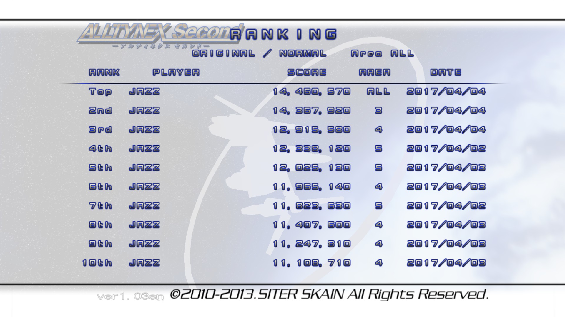 ALLTYNEX Second Normal - A Type | 11,949,810 | 2017-04-06 | ALLTYNEX Second Normal - A Type | 14,460,570 | 2017-04-06 | Musha Aleste Normal - Default | 133,755,390 | 2017-04-05 | RefleX Normal - ALFI-PH2RX Phoenix02 | 10,892,606 | 2017-03-26 | Kamui Normal - Default | 11,202,900 | 2017-03-20 |