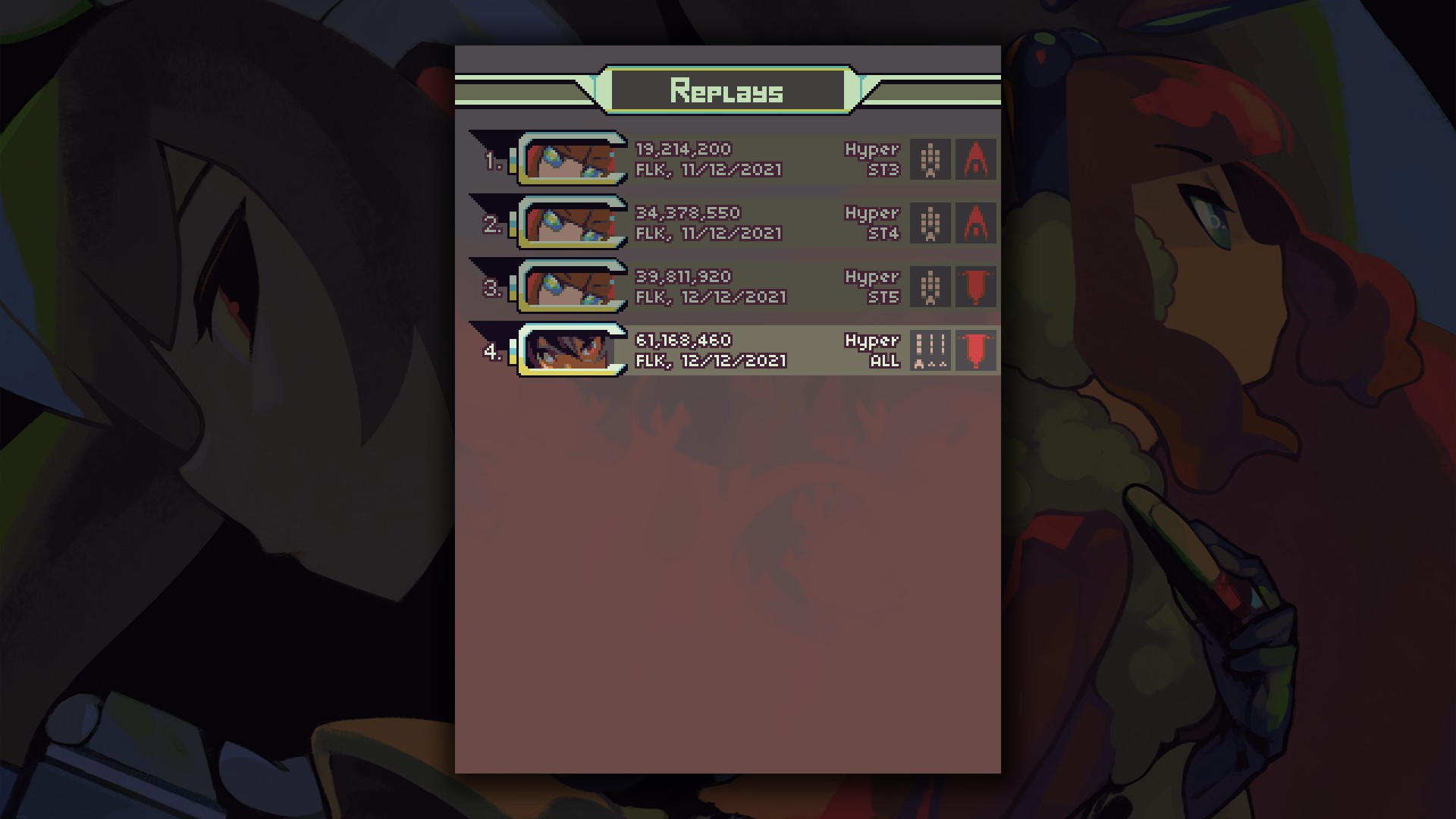 Dongfang qixiayuan ~ B... Normal - Reimu | 13,651,676,990 | 2025-11-06 | Maiden & Spell Stargazing Downward - V. Hard - Dreadwyrm Heir | 4,698,400 | 2025-08-24 | Maiden & Spell The Maiden Spellbound - V. Hard - Hero of Frost | 1,161,416 | 2025-08-24 | Maiden & Spell Sun Priestess - V. Hard - Sun Priestess | 7,303,204 | 2025-08-24 | Maiden & Spell Silent Redhood - V. Hard - Silent Redhood | 8,450,174 | 2025-08-24 | Maiden & Spell Royal Arcanist - V. Hard - Royal Arcanist | 7,690,404 | 2025-08-24 | Maiden & Spell Hero of Frost - V. Hard - Hero of Frost | 7,160,298 | 2025-08-24 | Maiden & Spell Royal Arcanist - V. Hard - Royal Arcanist | 2,994,854 | 2025-08-24 | Maiden & Spell Hero of Frost - V. Hard - Hero of Frost | 3,054,441 | 2025-08-24 | DRAINUS Arcade - Hard - Default | 2,323,682 | 2025-07-19 | DRAINUS Arcade - Extended - Default | 4,359,141 | 2025-07-18 | DRAINUS Arcade - Extended - Default | 2,757,639 | 2025-07-18 | Mushihimesama Original - Default | 61,670,931 | 2025-06-18 | Mushihimesama Maniac - Default | 117,533,618 | 2025-06-12 | Dongfang xuelian hua ~ ... Extra - Reimu & Yukari | 750,366,560 | 2025-04-08 | Dongfang xuelian hua ~ ... Lunatic - Reimu & Yukari | 3,334,798,810 | 2025-04-08 | Dongfang xuelian hua ~ ... Hard - Reimu & Yukari | 3,034,355,270 | 2025-04-08 | Dongfang xuelian hua ~ ... Normal - Reimu & Yukari | 2,786,761,880 | 2025-04-08 | Dongfang xuelian hua ~ ... Easy - Reimu & Yukari | 2,197,629,060 | 2025-04-08 | Super Galaxy Squadron E... Arcade - Hardcore Veteran - Black | 33,879,618 | 2025-03-11 | Super Galaxy Squadron E... Boss Rush - Black | 8,242,080 | 2025-03-11 | Zenodyne R Normal - XOP | 91,258,900 | 2025-02-14 | Zenodyne R Normal - G85-2173 | 88,296,700 | 2025-02-14 | Touhou Gyakumyouran ~ E... Lunatic - Tokiko | 1,165,082,300 | 2025-02-14 | Touhou Gyakumyouran ~ E... Dissonant Lunatic - Tokiko | 1,012,861,470 | 2025-02-14 | Touhou Gyakumyouran ~ E... Dissonant Elite Extra - Tokiko | 552,171,710 | 2025-02-14 | Touhou Gyakumyouran ~ E... Elite Extra - Tokiko | 820,108,260 | 2025-02-14 | Touhou Gyakumyouran ~ E... Dissonant Extra - Tokiko | 464,825,360 | 2025-02-14 | Touhou Gyakumyouran ~ E... Dissonant Normal - Tokiko | 1,345,752,840 | 2025-02-14 | Touhou Gyakumyouran ~ E... Dissonant Easy - Tokiko | 1,174,252,990 | 2025-02-14 | Touhou Gyakumyouran ~ E... Easy - Tokiko | 1,340,633,220 | 2025-02-14 | Touhou Gyakumyouran ~ E... Dissonant Hard - Tokiko | 1,328,247,130 | 2025-02-14 | Touhou Gyakumyouran ~ E... Hard - Kasen | 1,063,684,980 | 2025-02-14 | Touhou Gyakumyouran ~ E... Extra - Tokiko | 655,551,010 | 2025-02-14 | Touhou Gyakumyouran ~ E... Extra - Rin | 331,608,310 | 2025-02-14 | Touhou Gyakumyouran ~ E... Normal - Rin | 1,107,741,840 | 2025-02-14 | Ultimate Fatal Octopus Easy - Marisa A | 900,017,970 | 2025-02-04 | Ultimate Fatal Octopus Normal - Marisa A | 1,058,226,660 | 2025-02-04 | Ultimate Fatal Octopus Lunatic - Reimu B | 924,845,900 | 2025-02-04 | Ultimate Fatal Octopus Lunatic - Marisa A | 1,091,184,640 | 2025-02-04 | Ultimate Fatal Octopus Hard - Marisa A | 1,200,908,530 | 2025-02-04 | Dongfang zizhishu ~ Imm... Lunatic - Akira and Rola | 2,621,411,290 | 2025-01-30 | Dongfang zizhishu ~ Imm... Lunatic - Seija | 2,589,778,220 | 2025-01-30 | Dongfang zizhishu ~ Imm... Lunatic - Clownpiece | 2,388,792,310 | 2025-01-30 | Dongfang zizhishu ~ Imm... Lunatic - Marisa | 2,287,330,620 | 2025-01-30 | Dongfang zizhishu ~ Imm... Lunatic - Reimu | 2,212,644,530 | 2025-01-30 | Dongfang zizhishu ~ Imm... Extra - Akira and Rola | 1,197,421,650 | 2025-01-30 | Dongfang zizhishu ~ Imm... Extra - Seija | 1,386,573,520 | 2025-01-30 | Dongfang zizhishu ~ Imm... Extra - Clownpiece | 1,160,889,060 | 2025-01-30 | Dongfang zizhishu ~ Imm... Extra - Marisa | 1,256,773,630 | 2025-01-30 | Dongfang zizhishu ~ Imm... Extra - Reimu | 1,131,107,540 | 2025-01-30 | Dongfang zizhishu ~ Imm... Hard - Reimu | 1,502,247,850 | 2025-01-30 | Dongfang zizhishu ~ Imm... Hard - Akira and Rola | 2,448,971,420 | 2025-01-30 | Dongfang zizhishu ~ Imm... Normal - Akira and Rola | 2,329,602,400 | 2025-01-30 | Dongfang zizhishu ~ Imm... Easy - Akira and Rola | 1,988,892,440 | 2025-01-30 | Touhou Chaos of Black L... Lunatic - Yukari & Yuyuko | 1,227,480,570 | 2025-01-19 | Blue Revolver Double Ac... XP-Mode - Percept Bit | 224,157,400 | 2024-11-30 | Blue Revolver Double Ac... XP-Mode - Zap Drone | 268,781,200 | 2024-11-30 | Blue Revolver Double Ac... XP-Mode - Kinetic Orb | 248,911,900 | 2024-11-30 | Blue Revolver Double Ac... XP-Mode - Volt Cable | 269,727,100 | 2024-11-30 | Blue Revolver Double Ac... XP-Mode - Cascade Blast | 200,504,500 | 2024-11-30 | Blue Revolver Double Ac... Parallel - Dee/Cluster Missile | 169,033,700 | 2024-11-30 | Blue Revolver Double Ac... Parallel - Dee/Gun Buckler | 150,870,000 | 2024-11-30 | Blue Revolver Double Ac... Parallel - Dee/Pierce Lancer | 182,706,700 | 2024-11-30 | Blue Revolver Double Ac... Parallel - Dee/Fractal Salvo | 187,965,600 | 2024-11-30 | Blue Revolver Double Ac... Parallel - Val/Cluster Missile | 180,588,600 | 2024-11-30 | Blue Revolver Double Ac... Parallel - Val/Hyper Laser | 184,443,400 | 2024-11-30 | Blue Revolver Double Ac... Parallel - Val/Arc Caster | 168,350,200 | 2024-11-30 | Blue Revolver Double Ac... Parallel - Mae/Cluster Missile | 168,904,900 | 2024-11-30 | Blue Revolver Double Ac... Parallel - Mae/Vortex Barrier | 133,278,700 | 2024-11-30 | Blue Revolver Double Ac... Parallel - Mae/Hyper Laser | 153,930,400 | 2024-11-30 | Blue Revolver Double Ac... Parallel - Mae/Plasma Lancer | 164,869,700 | 2024-11-30 | Blue Revolver Double Ac... Parallel - Val/Stasis Field | 195,981,500 | 2024-11-30 | Dongfang yuan kong jie ... Lunatic - Reimu A | 2,740,017,040 | 2024-11-28 | Protocorgi Ultra Nightmare - Bullet | 251,815,233 | 2024-10-03 | Hazelnut Hex Moderate - B-Style | 5,480,050 | 2024-08-11 | Hazelnut Hex Normal - B-Style | 5,471,450 | 2024-08-11 | Redneg Allstars Swing-B... Endless Score - Yozuki | 271,435,818,146 | 2024-08-01 | Redneg A