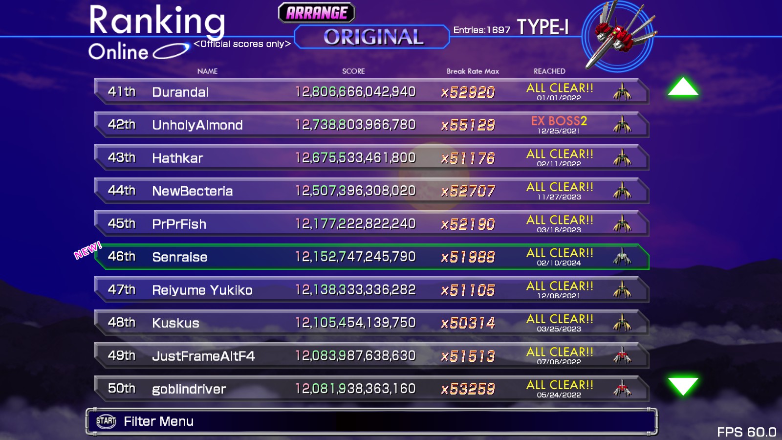 | PC | Type I | ALL CLEAR★ | 12,152,747,245,790  | Steam PC version 1.13f | 2024-02-11 |