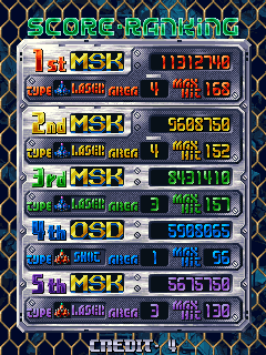 ShmupMAME v2.2 now, as v3.0 doesn't work for me anymore. Minor improvement that took quite a bit of effort to make; I wasn't even over my previous best at the end of 1-4. I figured out how to rack up Hits on bosses though.