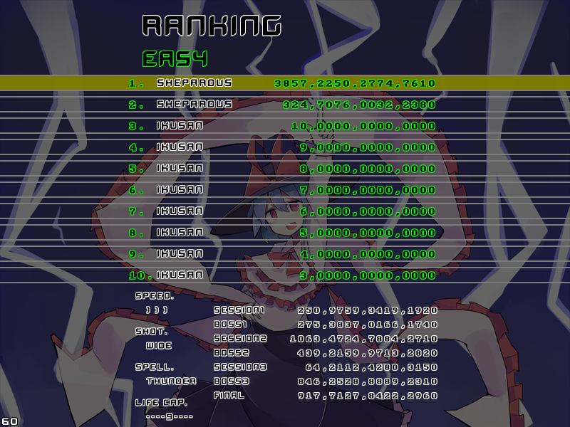| PC | Wide Thunder | Full★ | 7 | 5,181,409,363,175,500  | Got all stages and spellcards this time. | 2019-07-07 |