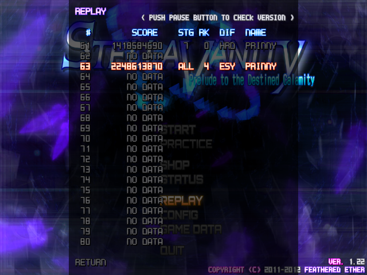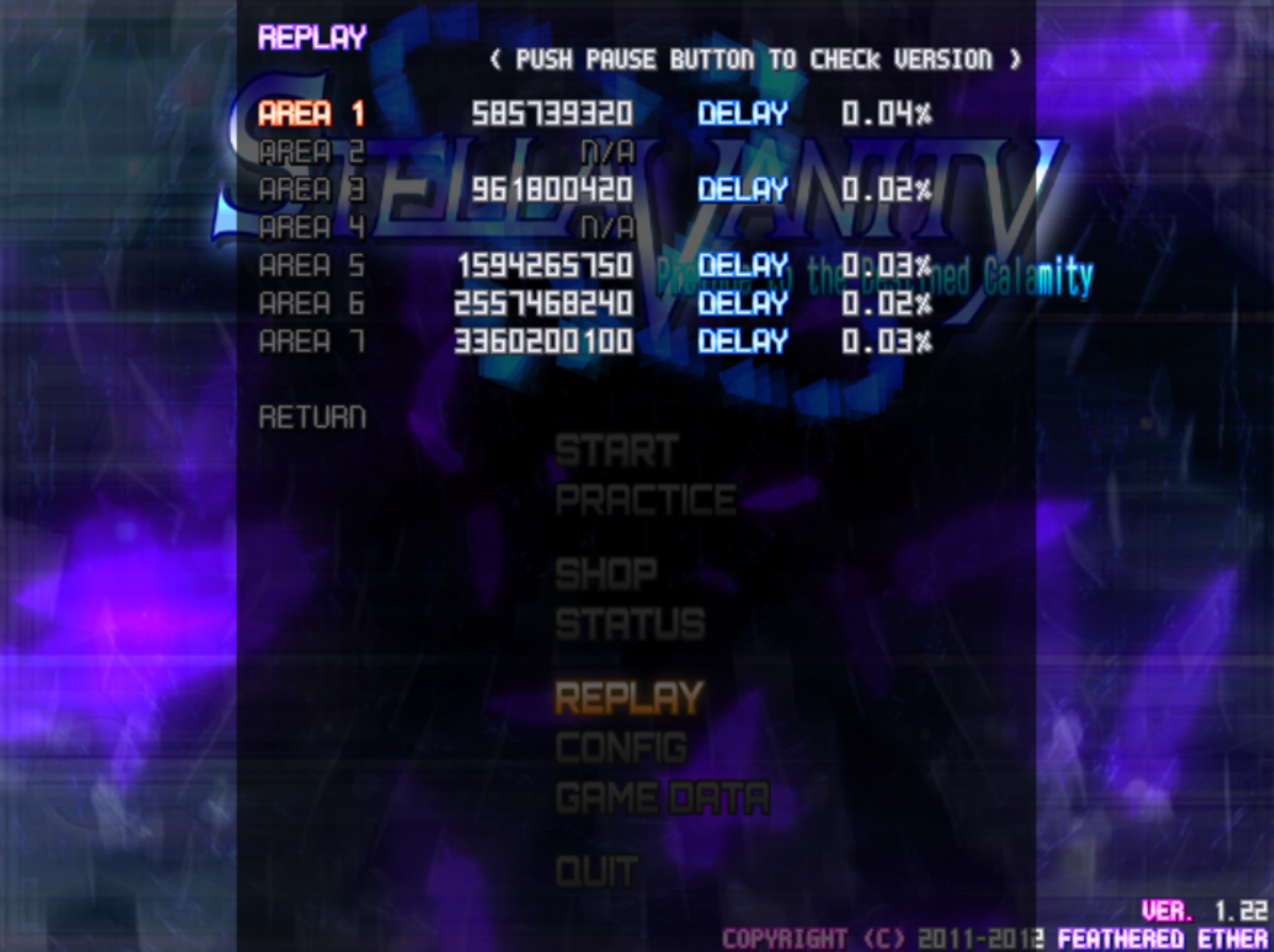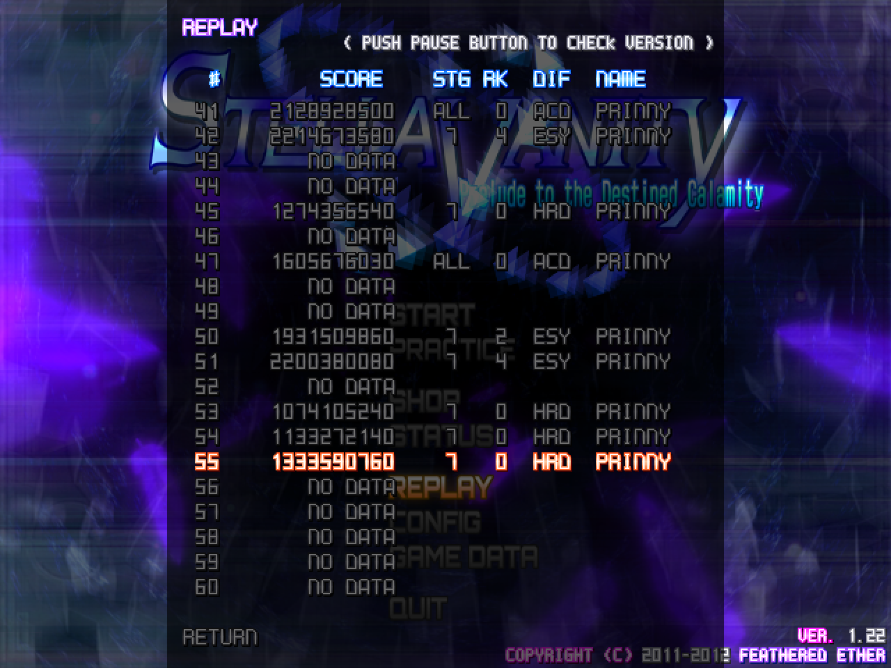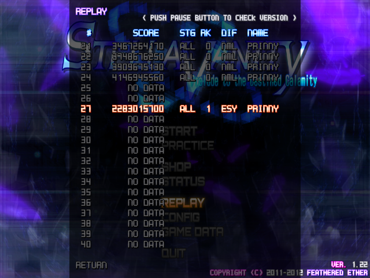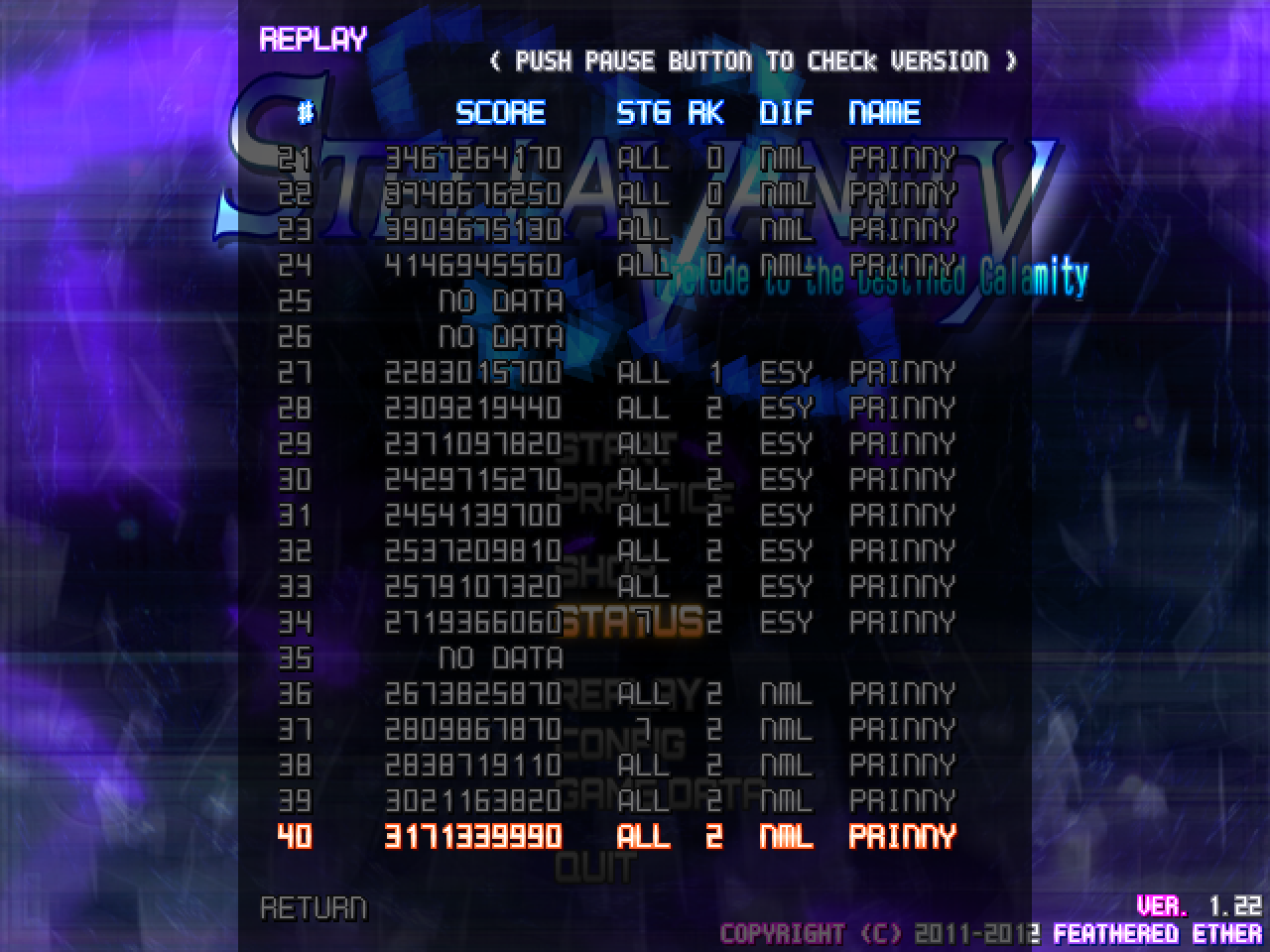 Revolgear Zero Standard - Advanced (1 Loop) - Turret | 5,121,450 |  | Crimzon Clover Arrange - Original - Type I | 6,064,423,797,550 |  | Ketsui ~Kizuna Jigoku T... Deathtiny - Tiger Schwert | 181,735,324 |  | Karous Normal Mode - Default | 1,024,721,740 |  | Battle Traverse Normal - Neider | 35,618,984 |  | Touhou Makuka Sai ~ Fan... Normal - Reimu | 12,299,797,890 |  | Crimzon Clover Arcade - Time Attack - Type I | 70,527,370 |  | Darius Gaiden Arcade - Route Z Prime - Silver Hawk | 6,004,000 |  | Darius Gaiden Arcade - Route Z - Silver Hawk | 6,783,770 |  | Darius Gaiden Arcade - Route V Prime - Silver Hawk | 7,655,830 |  | Darius Gaiden Arcade - Route X - Silver Hawk | 6,225,950 |  | Darius Gaiden Arcade - Route W - Silver Hawk | 6,480,150 |  | Darius Gaiden Arcade - Route Y - Silver Hawk | 8,053,360 |  | Darius Gaiden Arcade - Route V - Silver Hawk | 8,264,590 |  | Stella Vanity -Prelude ... Rule(Strict) - Type-C - Normal - Azerlete | 4,298,408,820 |  | Stella Vanity -Prelude ... Rule(Strict) - Type-C - Normal - Azerlete | 3,815,837,840 |  | Sonic Wings 3 Arcade - Blazers | 1,290,200 |  | Stella Vanity -Prelude ... Rule(Strict) - Type-C - Normal - Azerlete | 3,474,266,430 |  | Stella Vanity -Prelude ... Rule(Strict) - Type-C - Normal - Azerlete | 3,913,822,910 |  | Battle Garegga Premium - Wild Snail | 19,502,530 |  | Battle Garegga Premium - Wild Snail | 9,818,850 |  | Darius Arcade New Ver. - Route V - Silver Hawk | 3,391,710 |  | TWilight refrAIN Sequel - Mikahashi Sisters | 79,091,280 |  | Giga Wing Arcade - Stuck | 25,627,065,917,650 |  | Rolling Gunner Casual - RF-42RX STORK | 185,548,140 |  | Battle Garegga Arcade - Wild Snail | 6,234,500 |  | G.Darius Arcade - Route Lambda - Silver Hawk | 20,793,100 |  | Eden's Aegis Heaven - Nanathy | 144,955,910 |  | Stella Vanity -Prelude ... Rule(Strict) - Type-C - Normal - Azerlete *Obsoleted run | 3,171,339,990 |  | Stella Vanity -Prelude ... Rule(Strict) - Type-C - Easy - Azerlete | 2,719,366,060 |  | Stella Vanity -Prelude ... Rule(Strict) - Type-C - Easy - Azerlete | 2,537,209,810 |  | Stella Vanity -Prelude ... Rule(Strict) - Type-C - Easy - Azerlete | 2,429,715,270 |  | Stella Vanity -Prelude ... Rule(Strict) - Type-C - Easy - Azerlete | 2,283,015,700 |  | Shikigami no Shiro II Normal - Sayo Type 1 | 3,611,825,450 |  | Shikigami no Shiro II Normal - Kohtaro Type 2 | 4,850,403,560 |  | Shikigami no Shiro II Normal - Kohtaro Type 2 | 4,494,585,480 |  | Raiden IV Original Arcade - Original - Fighting Thunder ME-2 | 44,918,950 |  | Sisters Royale Normal - Nur | 4,085,625,690 |  | Sisters Royale Normal - Nur | 3,823,361,610 |  | Sisters Royale Normal - Nur | 3,585,976,930 |  | Danmaku Unlimited 3 Spirit - Medium - B/B | 3,208,812,910 |  | Eden's Aegis Original - Nanathy | 230,609,250 |  | Eden's Aegis Original - Nanathy *Obsoleted run | 226,459,640 |  | Eden's Aegis Original - Nanathy *Obsoleted run | 222,782,460 |  | Stella Vanity -Prelude ... Rule(Strict) - Type-S - Normal - Azerlete | 4,146,945,560 |  | Leiria -Stargazer- Hard - A Type | 2,045,637,770 |  | HellSinker Full Sequence Order - Spirit - Fossilmaiden | 52,085 |  | Natsuki Chronicles Arcade - Normal - Default | 32,981,665 |  | Leiria -Stargazer- Normal - A Type | 658,769,640 |  | Leiria -Stargazer- Normal - A Type | 597,512,350 |  | Stella Vanity -Prelude ... Rule(Strict) - Type-S - Easy - Azerlete | 3,413,958,190 |  | Stella Vanity -Prelude ... Rule(Strict) - Type-S - Easy - Azerlete | 3,053,941,410 |  | Stella Vanity -Prelude ... Rule(Strict) - Type-S - Easy - Azerlete | 3,013,778,660 |  | Stella Vanity -Prelude ... Rule(Strict) - Type-S - Normal - Azerlete | 3,729,501,760 |  | Stella Vanity -Prelude ... Rule(Strict) - Type-S - Easy - Azerlete | 2,576,174,230 |  | Magical Singular Day -a... Moderate - Type-B | 512,485,789,440 |  | Stella Vanity -Prelude ... Rule(Strict) - Type-S - Normal - Azerlete | 3,360,200,100 |  | Sisters Royale Normal - Nur | 3,191,362,240 |  | Sisters Royale Normal - Sonay | 2,723,496,010 |  | Stella Vanity -Prelude ... Rule(Strict) - Type-C - Arcade - Azerlete | 1,825,293,240 |  | Sisters Royale Normal - Nur *Obsoleted run | 2,452,103,860 |  | Stella Vanity -Prelude ... Rule(Strict) - Type-S - Normal - Azerlete *Obsoleted run | 2,804,306,250 |  | Neko Navy Hard - Eugene | 2,279,396,480 |  | Neko Navy Easy - Mugi | 1,516,343,320 |  | Touhou Makuka Sai ~ Fan... Hard - Sanae | 2,242,038,510 |  | Flame Zapper Kotsujin Normal - Default | 12,009,040 |  | Touhou Fuujinroku ~ Mou... Normal - Reimu B | 777,409,860 |  | Touhou Yumejikuu ~ Phan... Normal - Ellen | 43,299,280 |  | Psyvariar -Medium Unit- Arcade - Default | 16,009,710 |  | Stella Vanity -Prelude ... Rule(Strict) - Type-C - Hard - Azerlete | 1,521,715,920 |  | Stella Vanity -Prelude ... Rule(Strict) - Type-S - Easy - Azerlete | 2,248,613,870 |  | Stella Vanity -Prelude ... Rule(Strict) - Type-C - Hard - Azerlete | 1,333,590,760 |  | Touhou Makuka Sai ~ Fan... Hard - Reimu | 14,056,792,410 |  | Touhou Yumejikuu ~ Phan... Normal - Rikako | 33,145,790 |  | Touhou Yumejikuu ~ Phan... Normal - Kotohime | 42,149,200 |  | Touhou Makuka Sai ~ Fan... Hard - Reimu | 13,164,009,120 |  | Touhou Makuka Sai ~ Fan... Hard - Reimu | 12,990,454,400 |  | Touhou Makuka Sai ~ Fan... Normal - Reimu | 12,838,797,350 |  | Dariusburst Another Chr... Original EX - Route Z - Formula | 151,443,050 |  | Dariusburst Another Chr... Original EX - Route X - Gaiden | 132,921,100 |  | Dariusburst Another Chr... Original EX - Route V - Genesis | 122,374,850 |  | RefRain ~prism memori... Re:Normal - Mews | 5,942,580,070 |  | RefRain ~prism memori... Re:Normal - Mews | 3,007,596,460 |  | HellSinker The Way of All Flesh - Spirit - Fossilmaiden | 3,026 |  | HellSinker Full Sequence Order - Spirit - Fossilmaiden | 33,302 |  | HellSinker The Great Majority - Spirit - Fossilmaiden | 8,743 |  | HellSinker Full Sequence Order - Spirit - Fossilmaiden *Obsoleted run | 24,618 |  | Touhou Yumejikuu ~ Phan... Normal - Marisa | 32,381,320 |  |